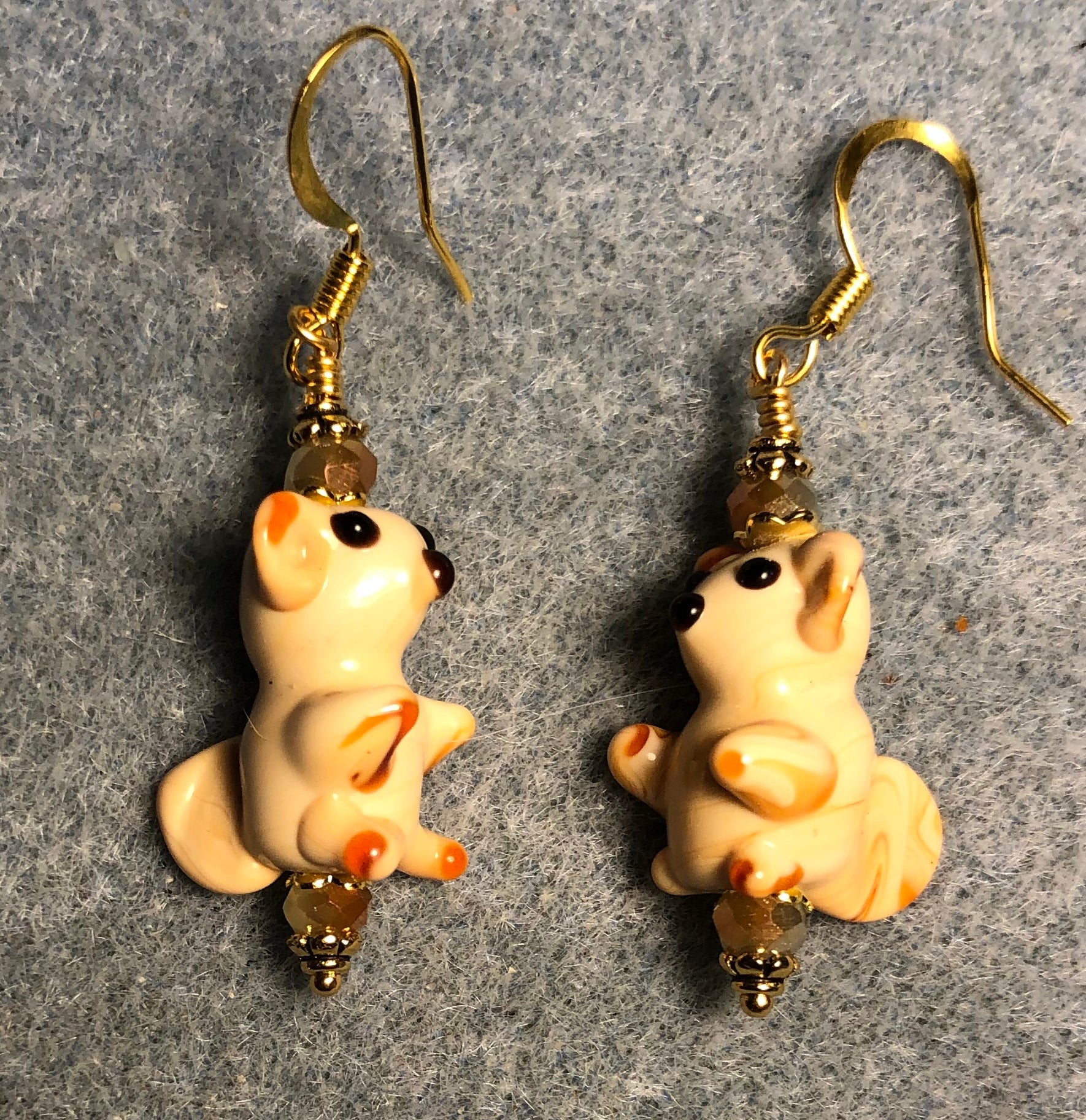 Small tan lamp work squirrel bead earrings adorned with tan Chinese crystal beads.