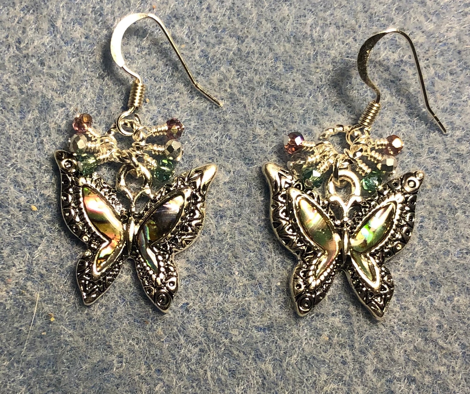 Silver and abalone butterfly charm earrings adorned with tiny dangling green, silver, and violet Chinese crystal beads.
