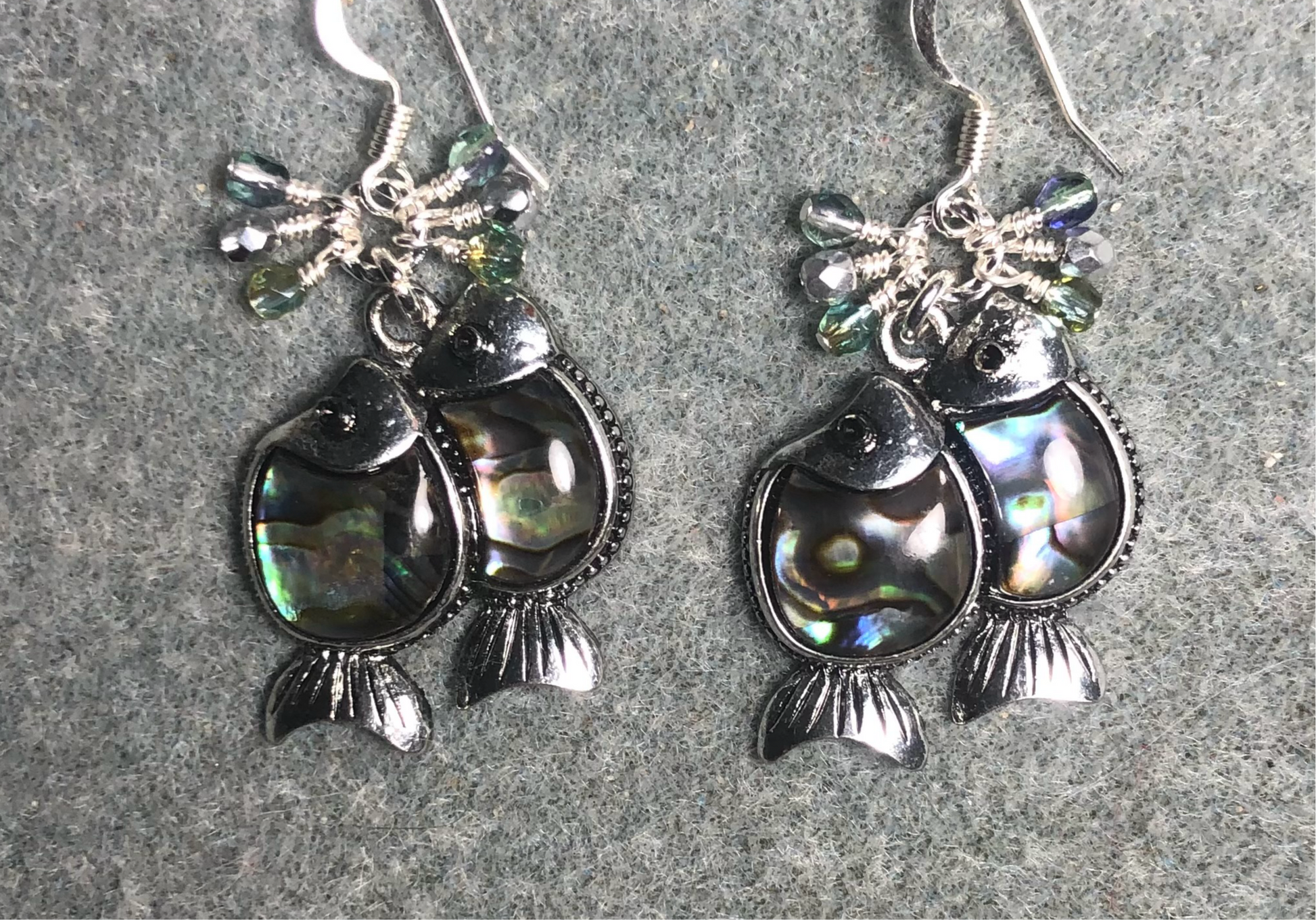 Silver and abalone fish charm earrings adorned with small dangling green, silver, and purple Czech glass beads.