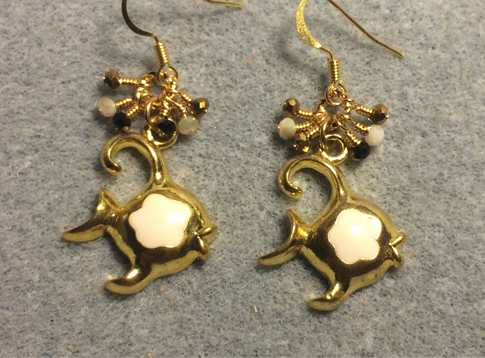 These adorable earrings are made with gold and off white enamel angelfish charms and are adorned with tiny dangling gold and off white Chinese crystal beads.