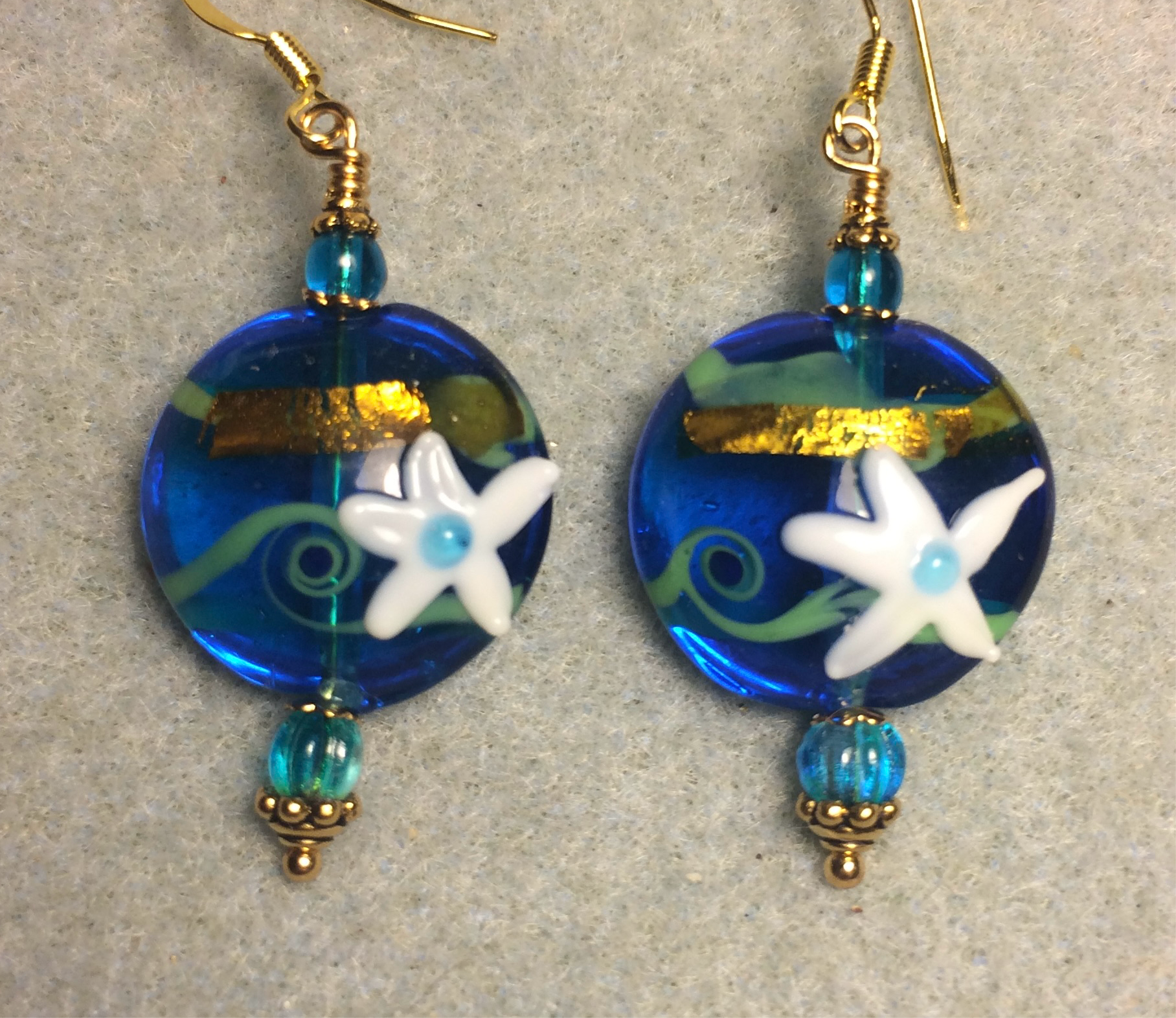 These beautiful earrings are made with turquoise, white, and gold lamp work starfish beads and are adorned with turquoise Czech glass beads. The beads themselves are turquoise with green swirls and gold stripes and the starfish are white with turquoise spots.