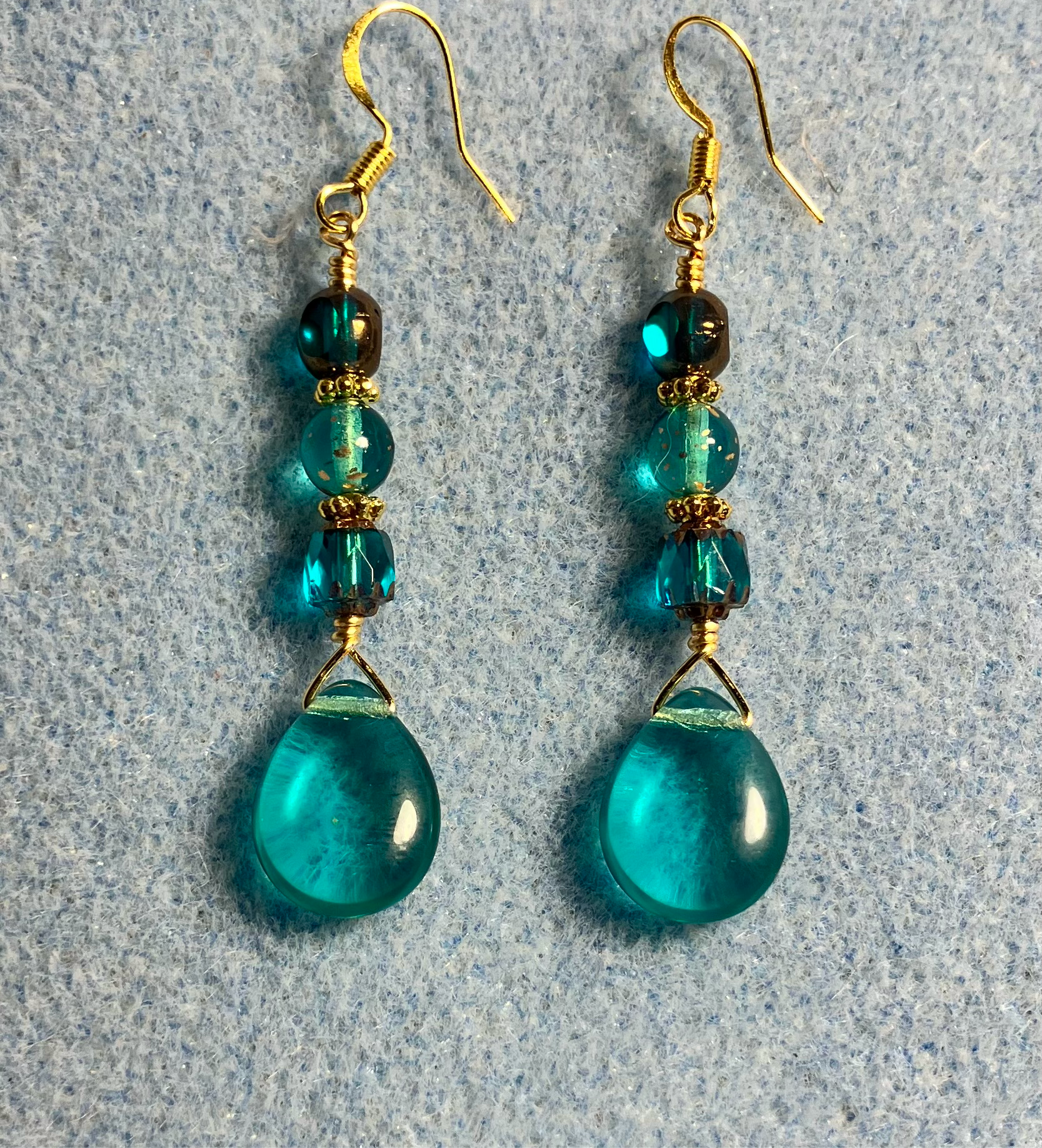 Translucent teal Czech glass pear drop bead earrings adorned with teal Czech glass beads.