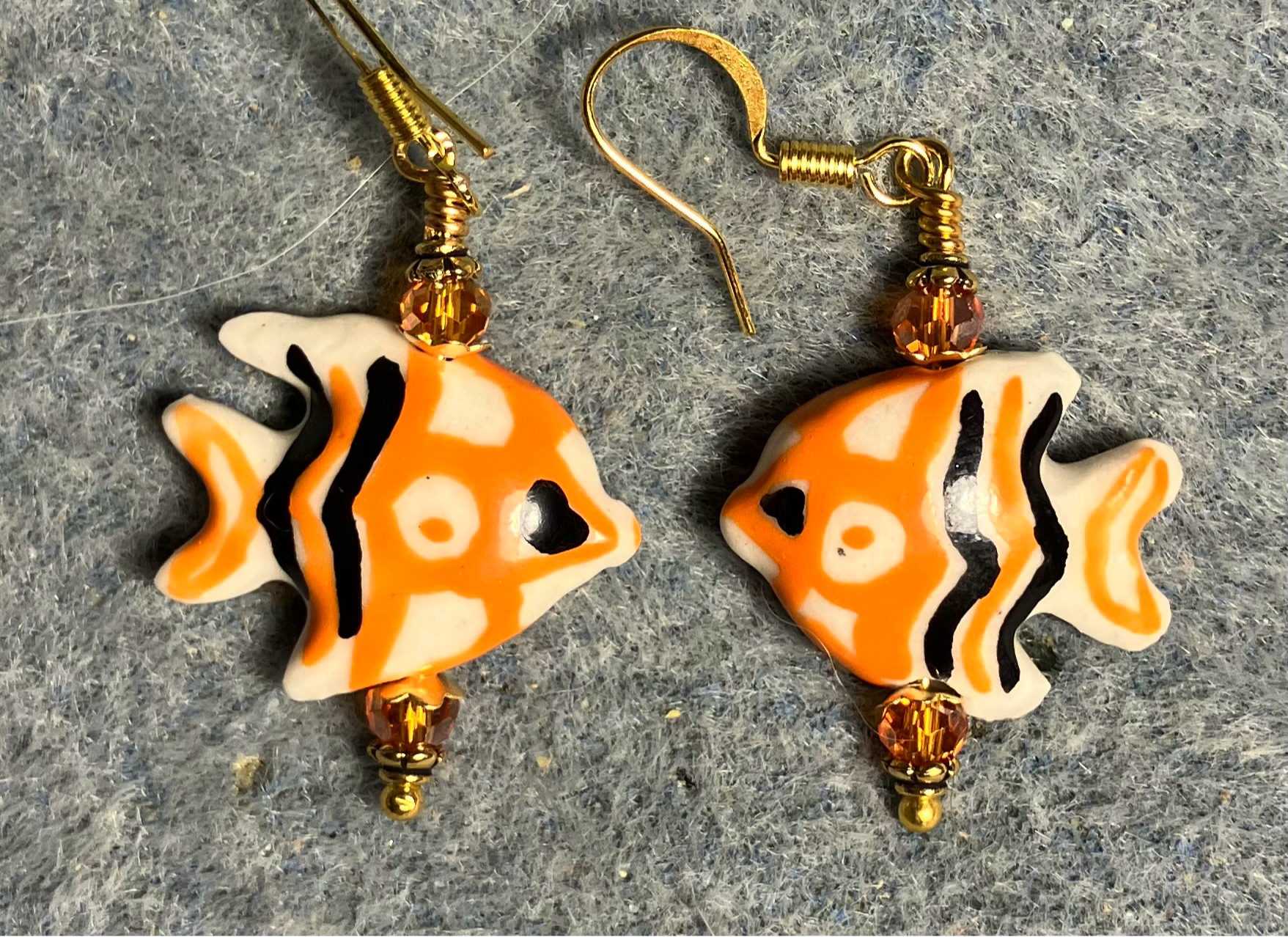 These adorable earrings are made with orange and black ceramic angelfish beads and are adorned with orange Chinese crystal beads.