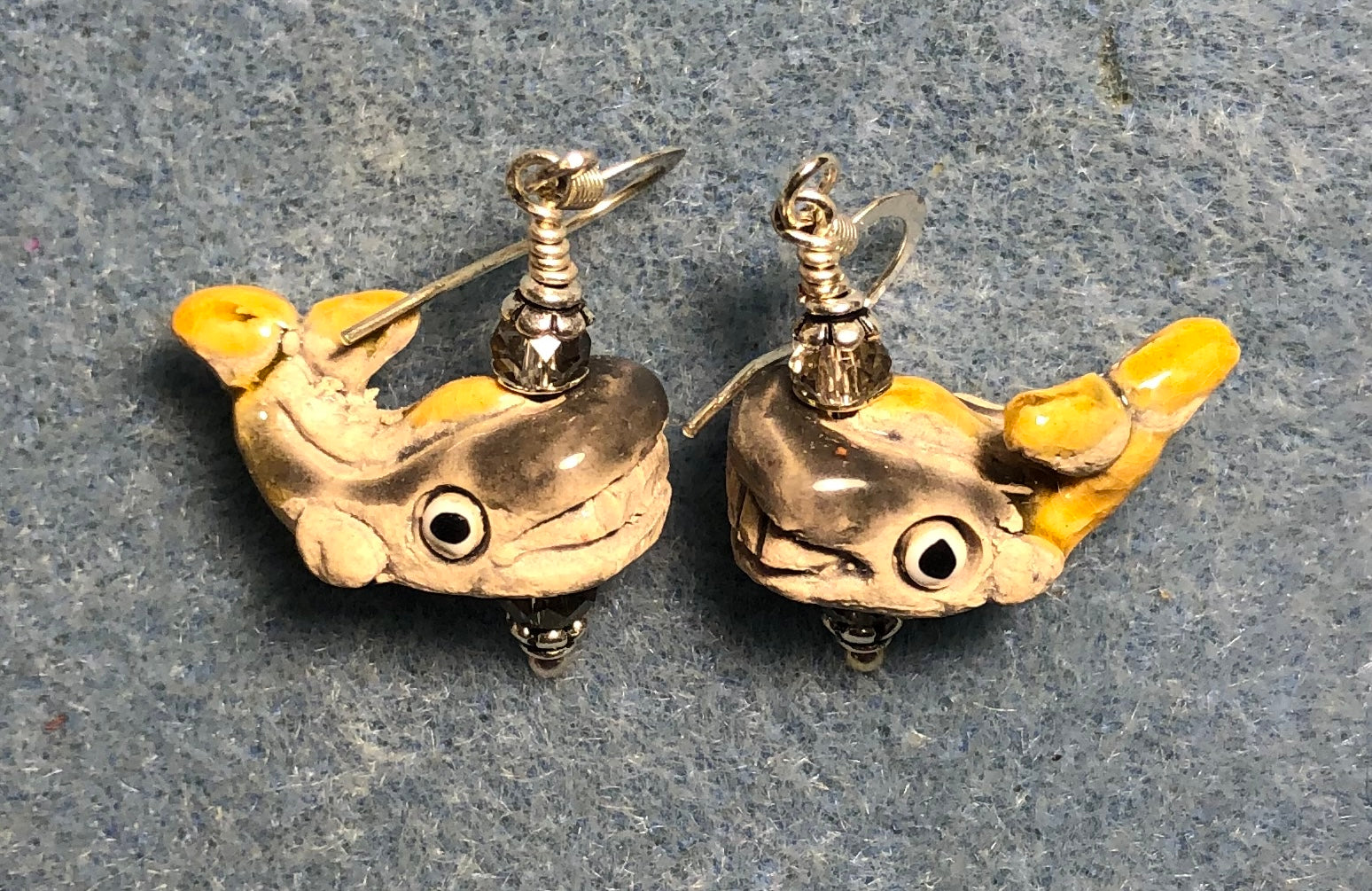 These adorable earrings are made with small gray and yellow ceramic whale beads and are adorned with gray Chinese crystal beads. These whales have big eyes and huge smiles.