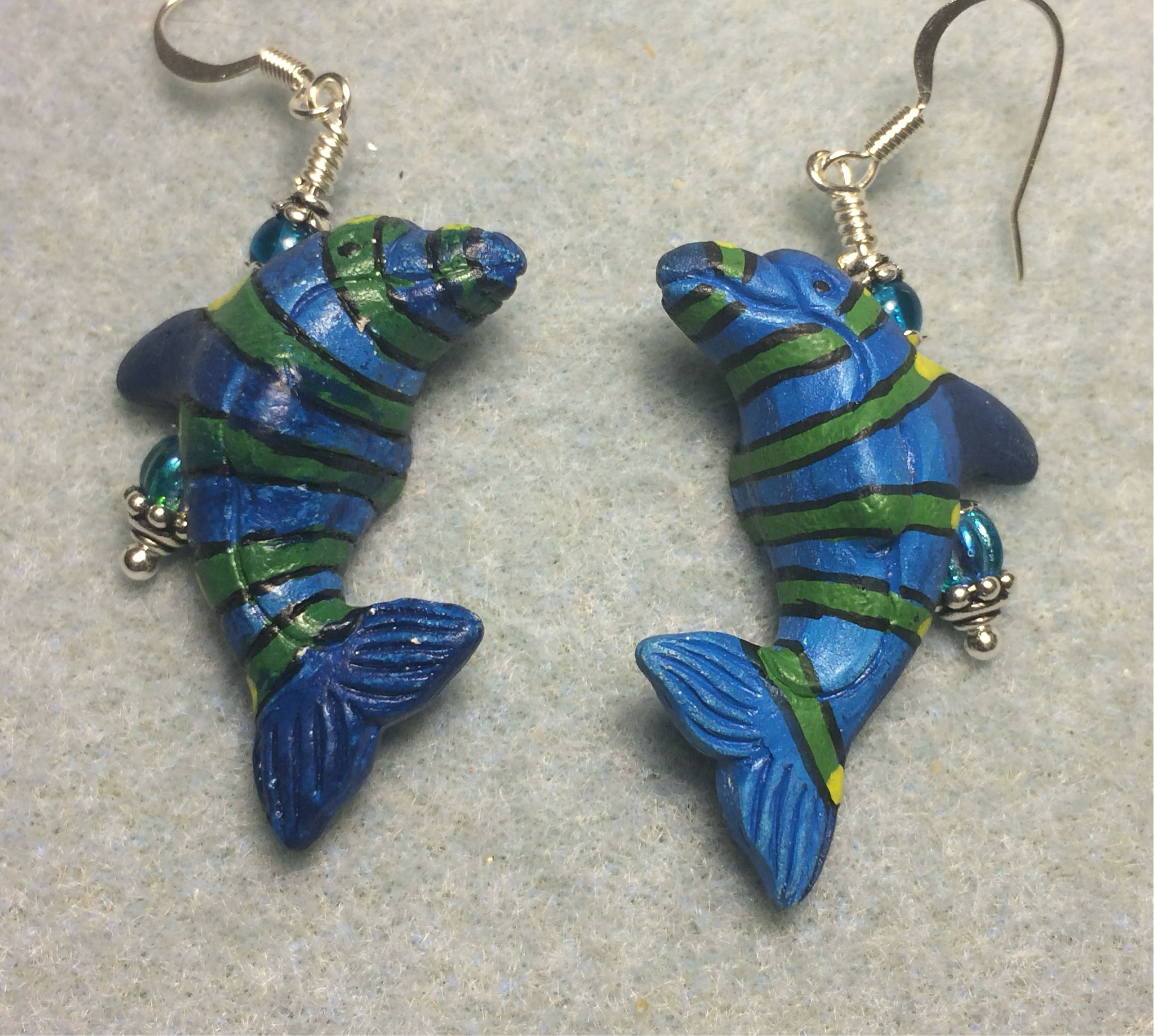 Turquoise blue and green ceramic striped dolphin bead earrings adorned with turquoise Czech glass beads.