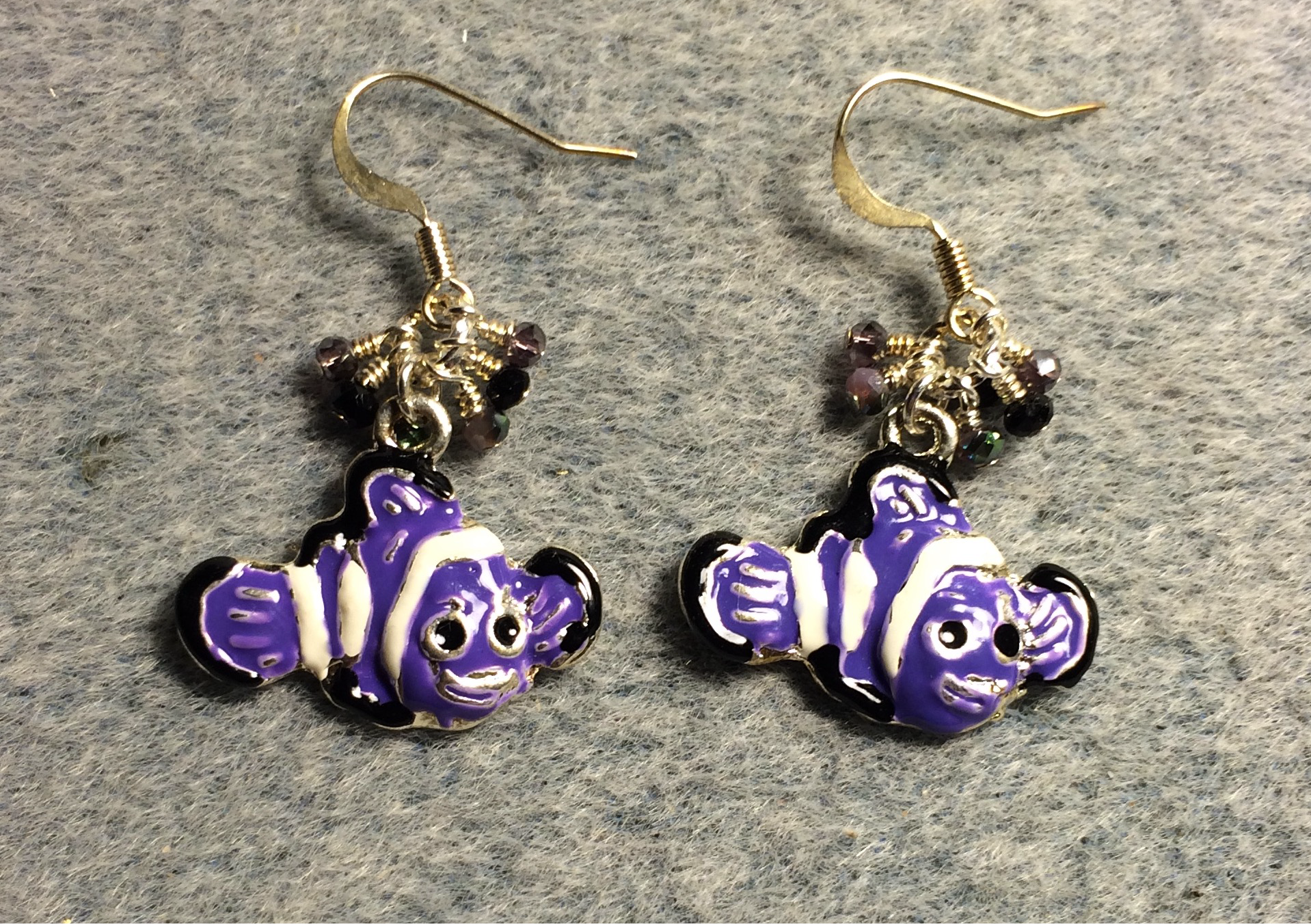These adorable earrings are made with purple, black, and white enamel striped fish charms and are adorned with tiny dangling purple and black Chinese crystal beads.