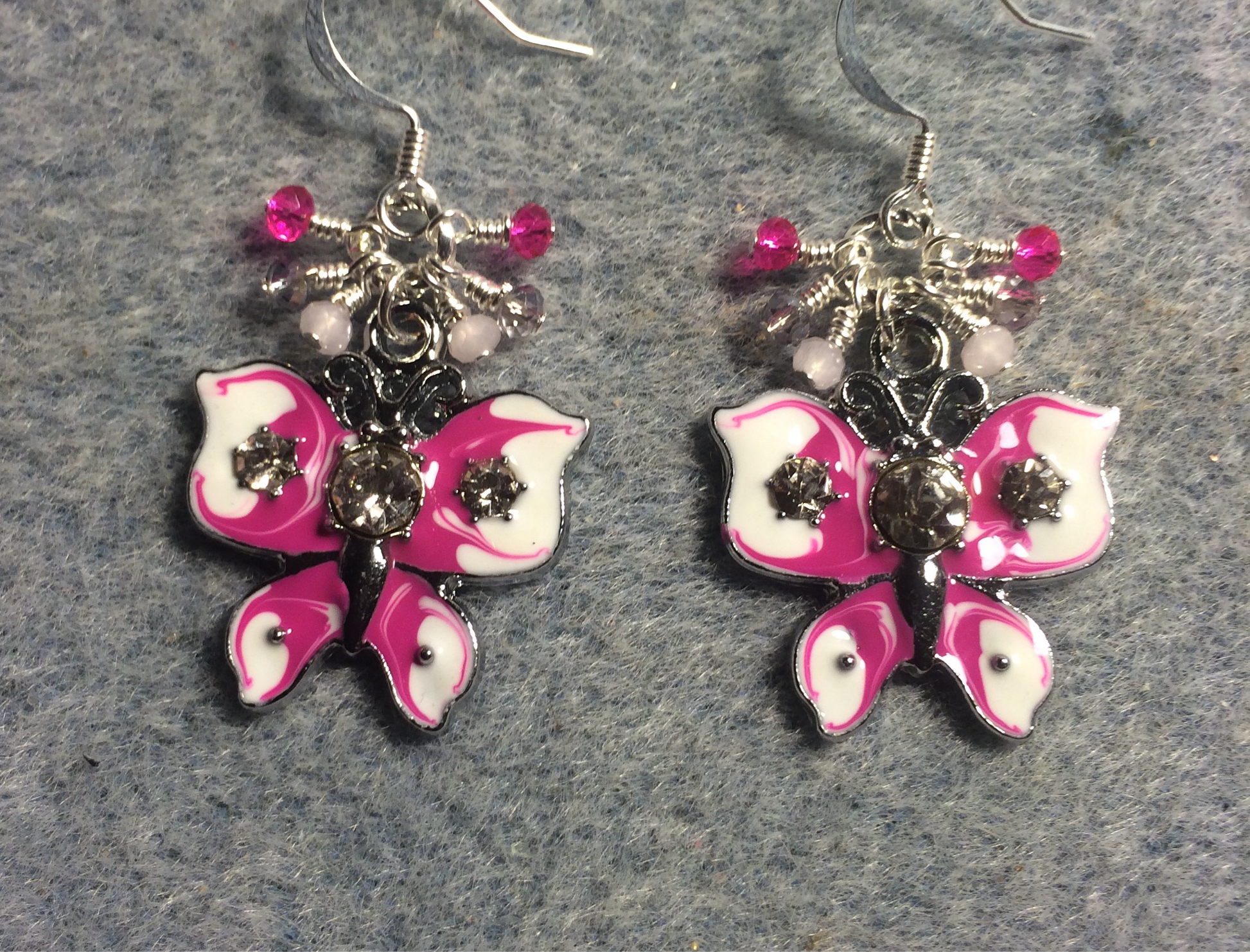 These adorable earrings are made with vintage hot pink and white enamel and rhinestone butterfly charms and are adorned with tiny dangling hot pink and light pink Chinese crystal beads.