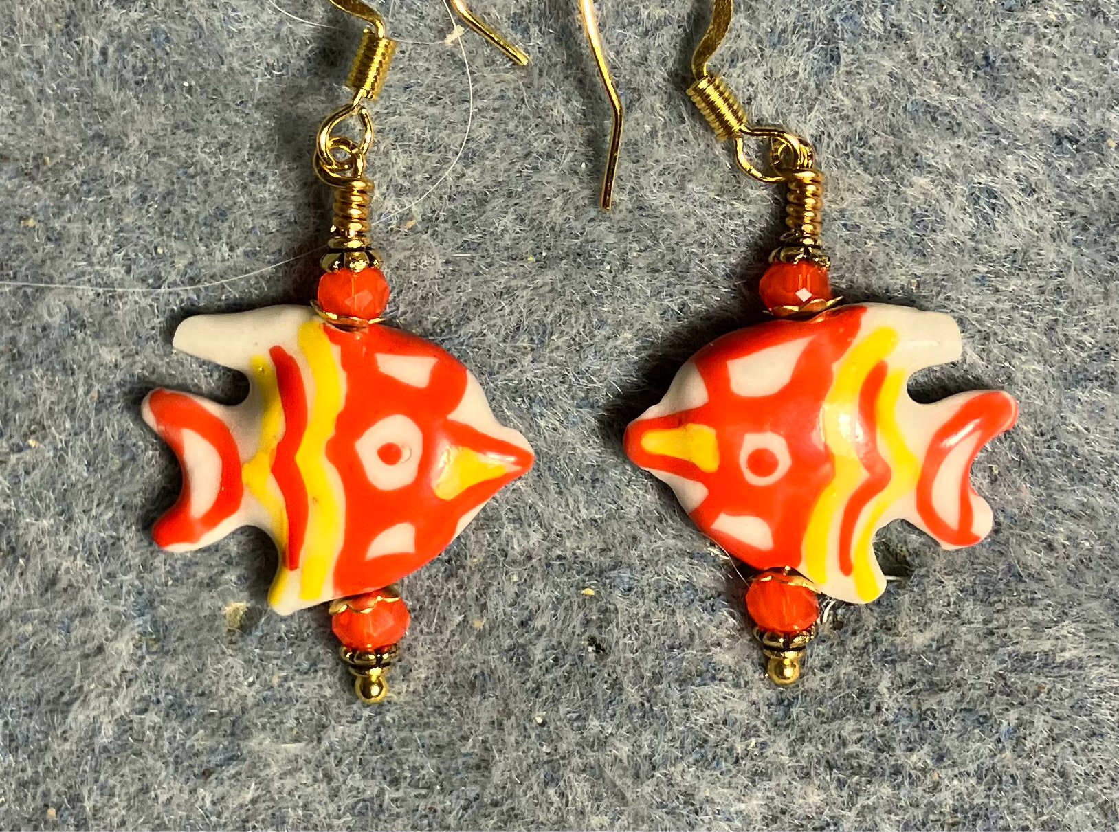 Orange and yellow ceramic angelfish bead earrings adorned with orange Chinese crystal beads.