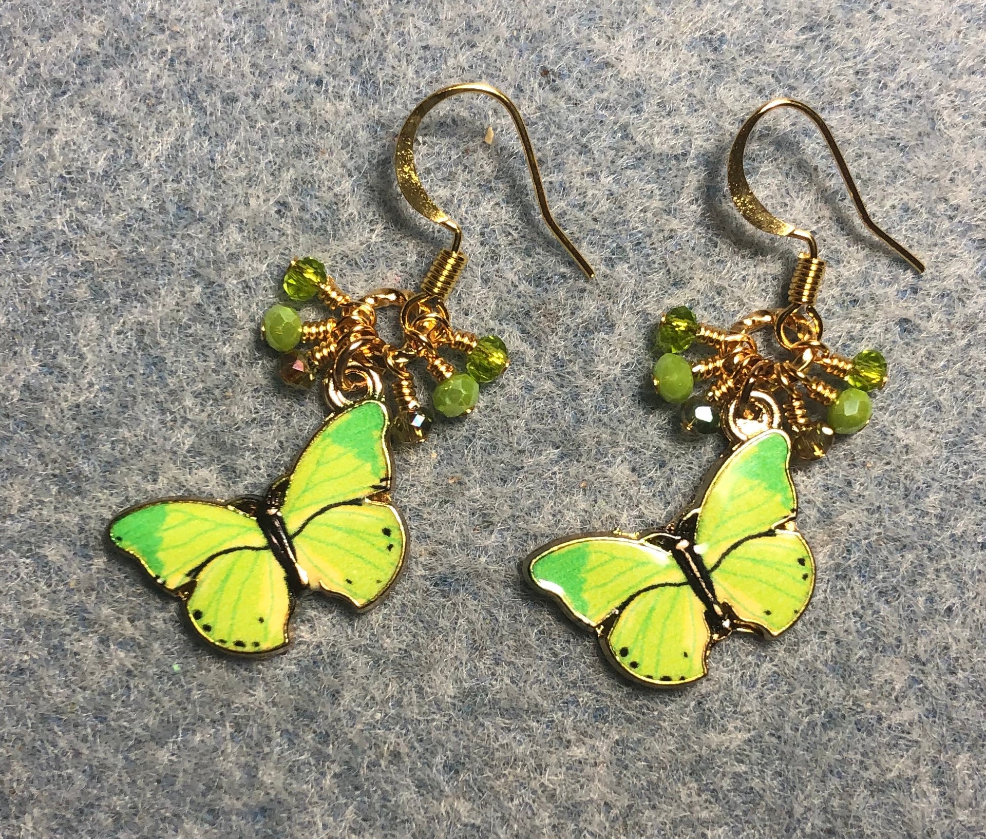 These adorable earrings are made with apple green enamel butterfly charms and are adorned with tiny dangling apple green and olive green Chinese crystal beads.