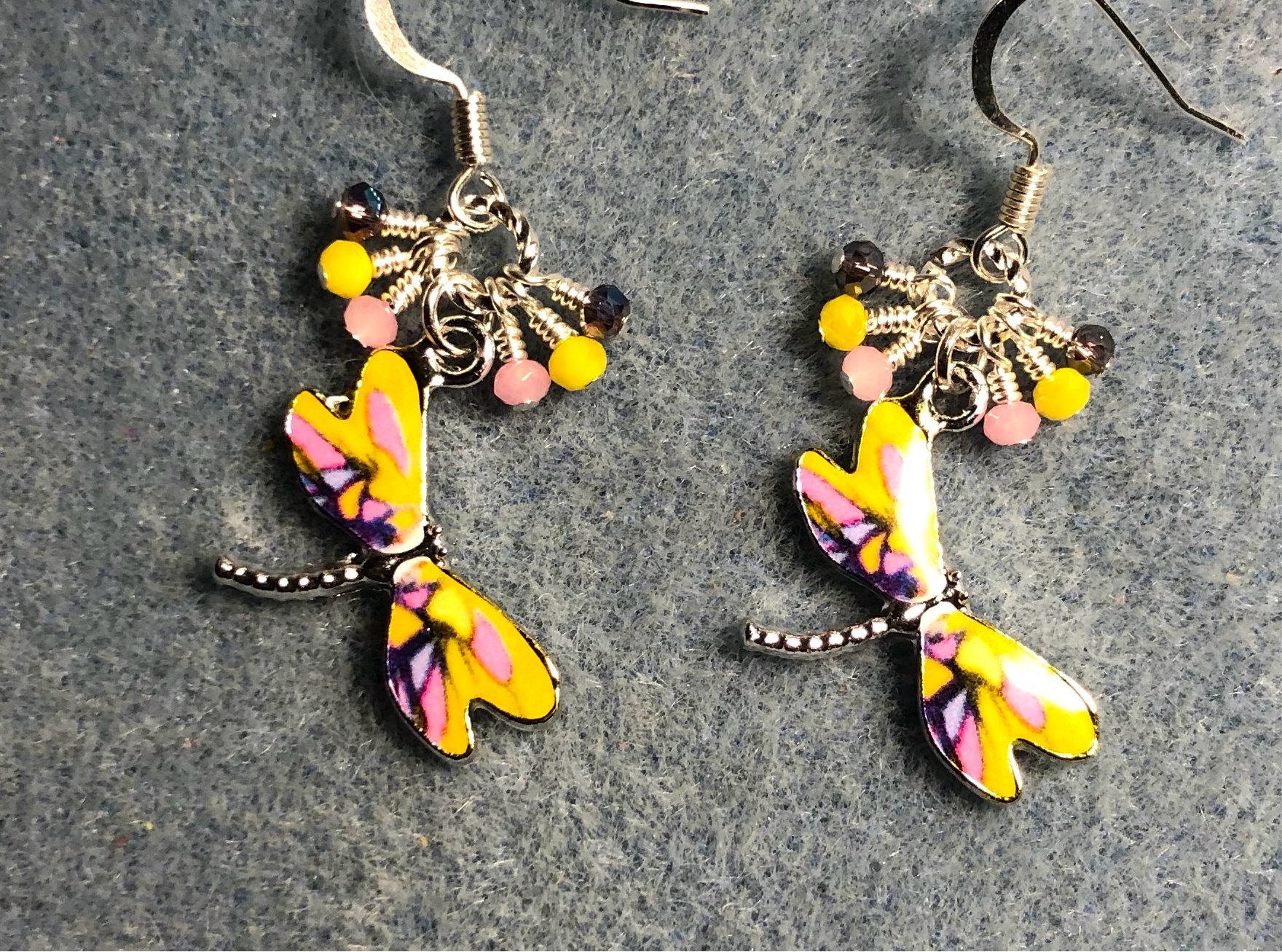 These adorable earrings are made with yellow, pink, and purple enamel dragonfly charms and are adorned with tiny dangling yellow, pink, and purple Chinese crystal beads.