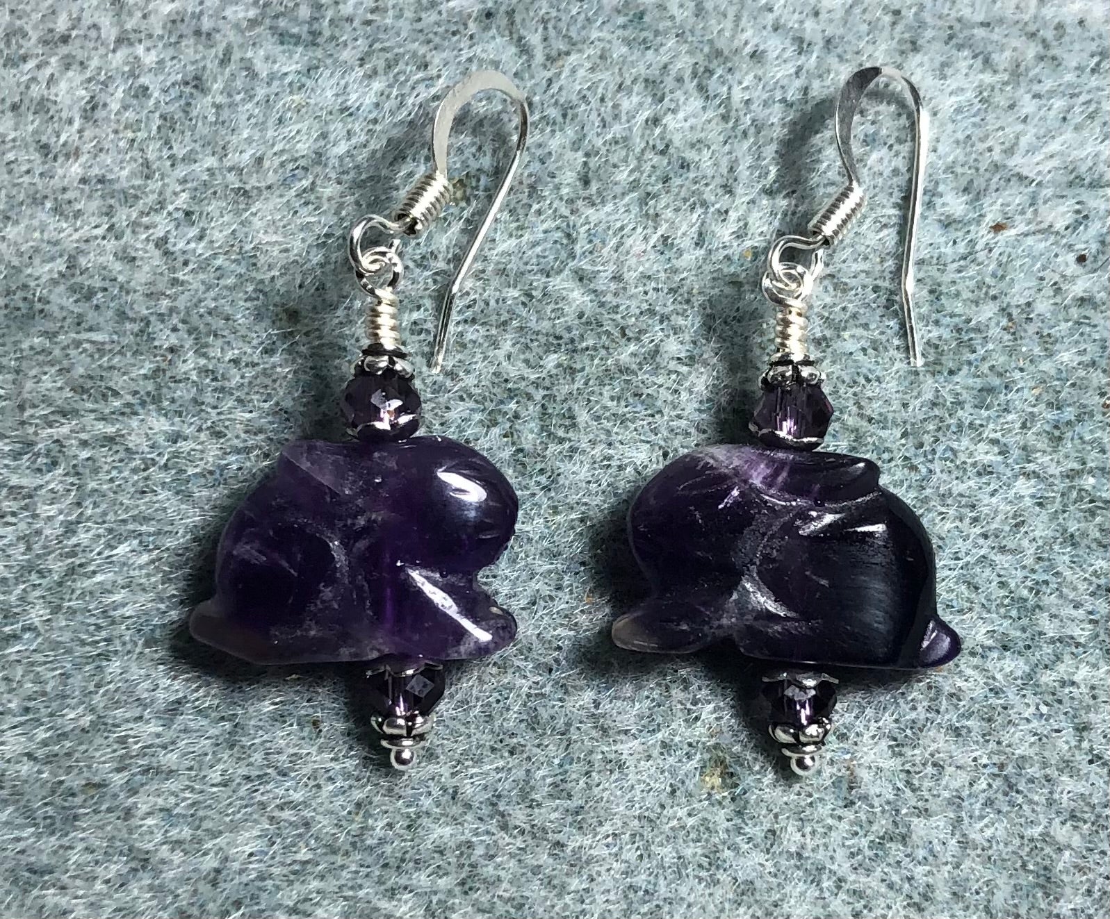 Genuine amethyst gemstone rabbit fetish bead earrings adorned with purple Chinese crystal beads.