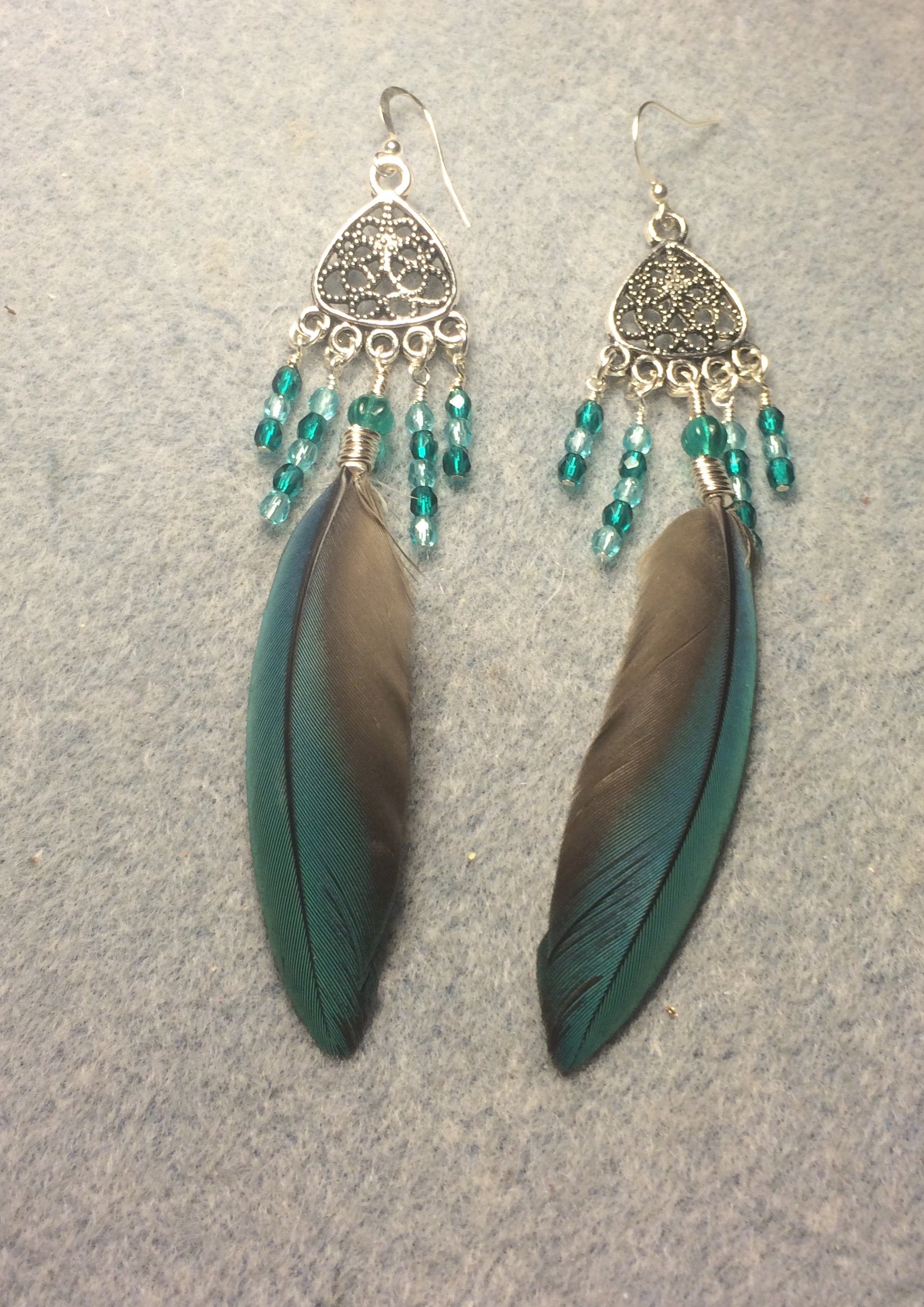 These beautiful turquoise feathers were donated by my blue and gold macaw Ninianne. The feathers are attached to silver chandelier findings and are adorned with small turquoise Czech glass beads. The earrings are about 4.5 inches long.
