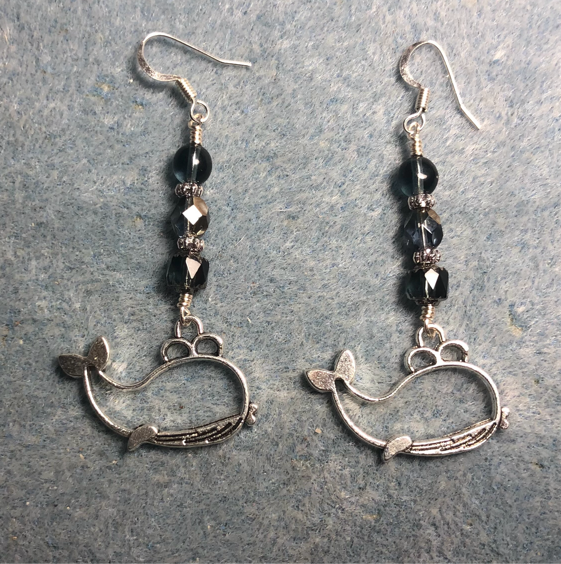 Silver spouting whale charm earrings adorned with Montana blue Czech glass beads