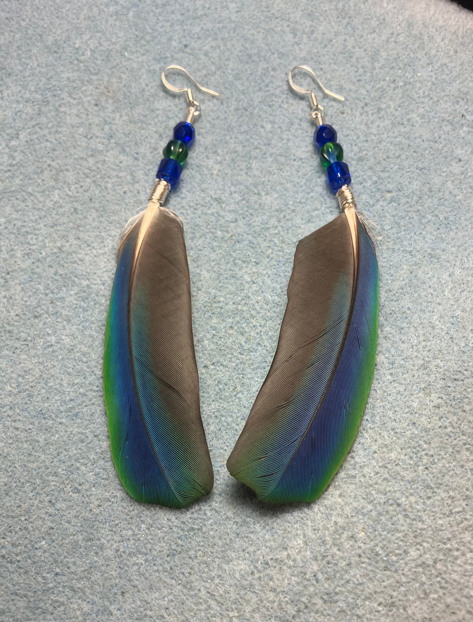 These gorgeous blue and green feathers were donated by my white-capped Pionus parrot Big Bird. These are extremely rare feathers. These earrings are made with silver wire and are adorned with blue and green Czech glass beads. The earrings are about 4.0 inches long.